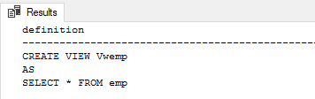 SELECT OBJECT_DEFINITION ( OBJECT_ID ( 'dbo.Vwemp' ) ) view_info;The following output shows the result of the above statement.
