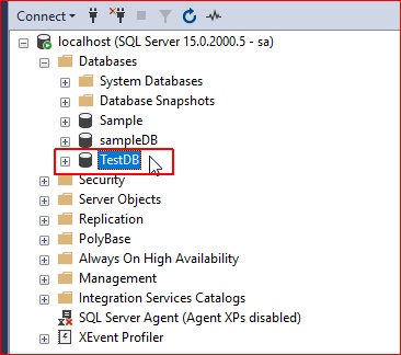 The below statement creates a new database named sampleDB.CREATE DATABASE sampleDB;Once the statement is completed successfully, you can check the name of the database using the below query which lists all the database name the SQL Server instance.