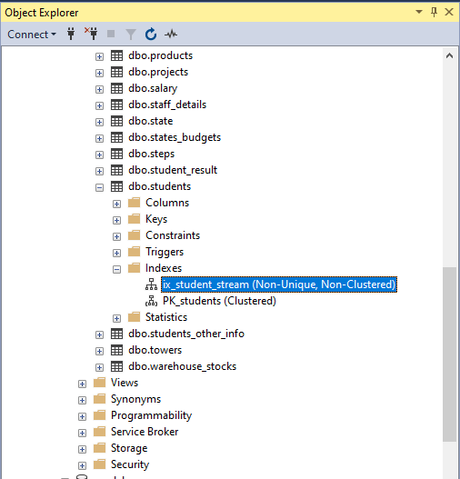 We have a table in our database called students which contains basic student information. The table has two indexes defined on it by the names PK_students and ix_stream_index as can be seen below in the screenshot from the SSMS GUI and the output of the T-SQL command which lists the index names for a table.